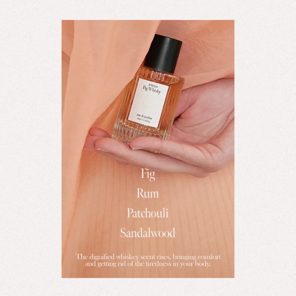 anillO’s Fig Whisky Eau De Parfum opens with ripe fig and smoky rum, deepening into woods and amber for a fragrance that feels bold yet comforting